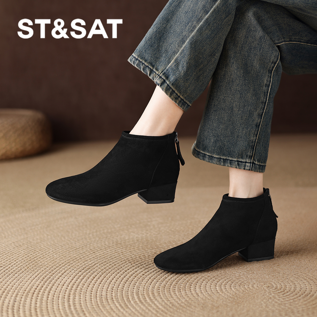 星期六黑色绒面瘦瘦小短靴2025新款秋冬季加绒女款踝靴皮靴女靴子