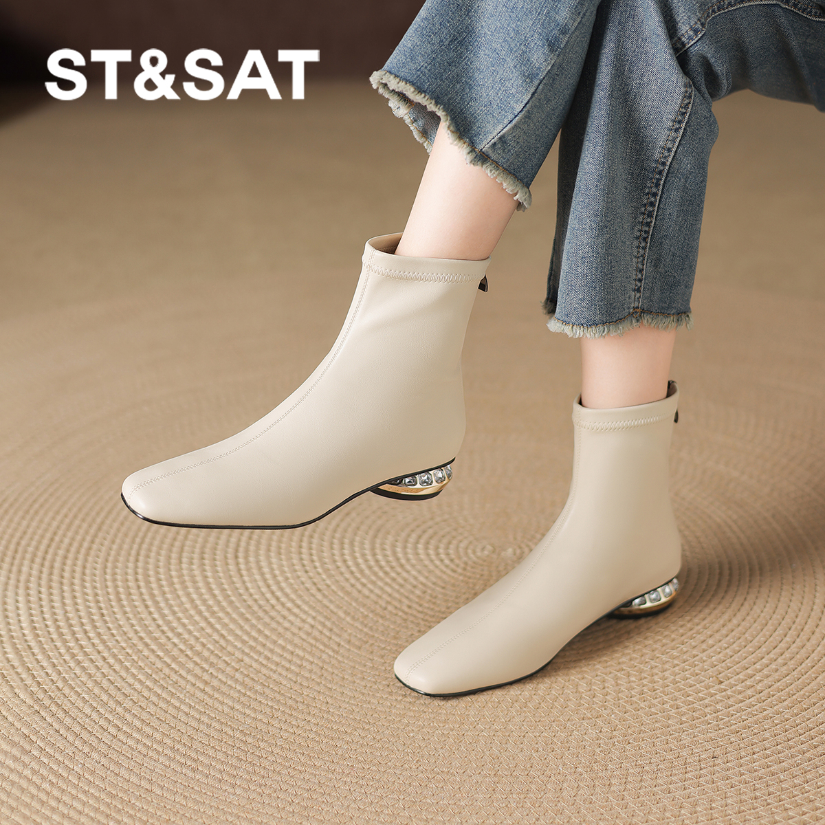 星期六方头白色小短靴2025新款女款女靴子瘦瘦皮靴子早秋冬季加绒