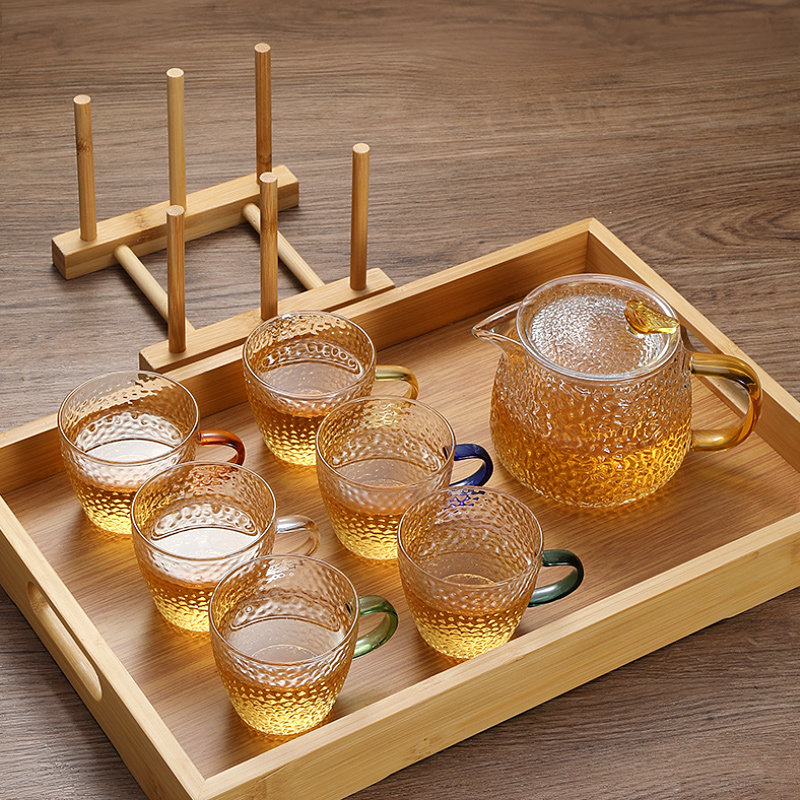 耐高温锤目纹玻璃茶杯彩色带把公道杯家用客厅品茗杯功夫茶具套装
