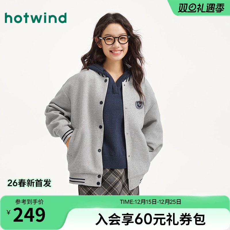 热风女士外套2026年春季新款复古学院风棒球服灰色春秋外套上衣