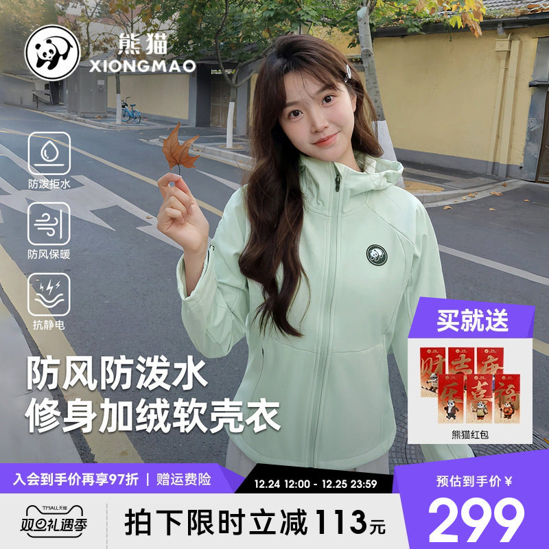 熊猫软壳衣短外套女2025新款春季保暖加绒防风防水运动休闲女外套