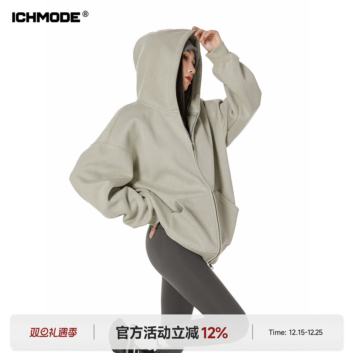 ICH MODE 美式重磅灰色卫衣外套女春季新款宽松连帽拉链开衫上衣