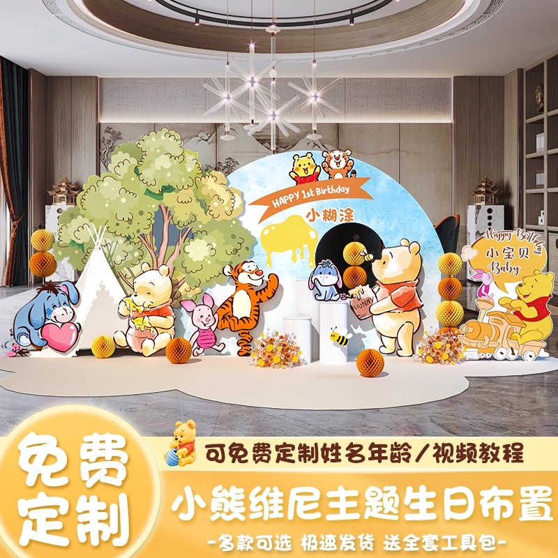小熊维尼宝宝周岁生日布置装饰满月百日天迪士尼定制kt板气球背景