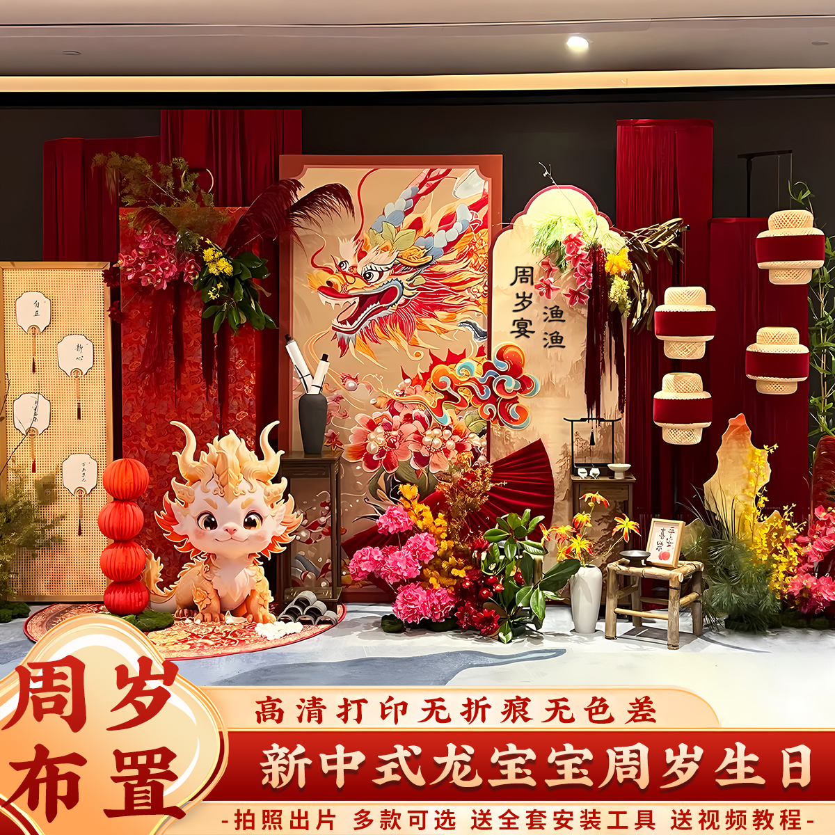 卡通龙宝宝周岁生日布置装饰家庭版KT板背景墙新中式过生日背景板