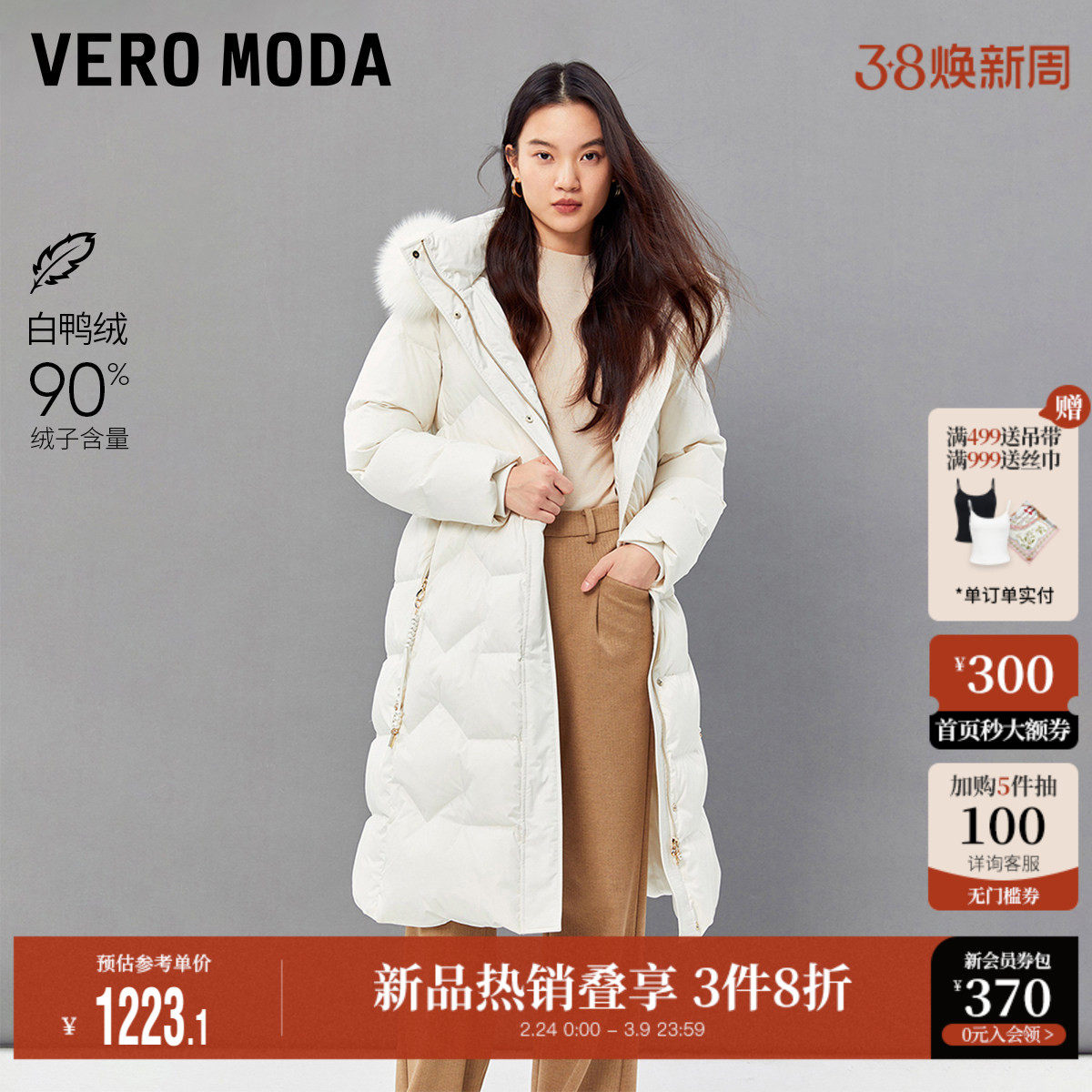 Vero Moda奥莱羽绒服女冬季新款优雅气质女人纯色狐狸毛白鸭绒
