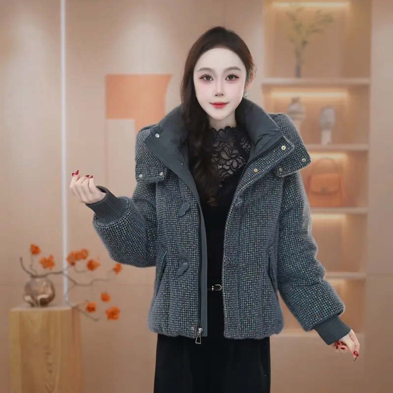 轻奢风短款羽绒服女2025新款冬季连帽格纹白鸭绒保暖显瘦外套