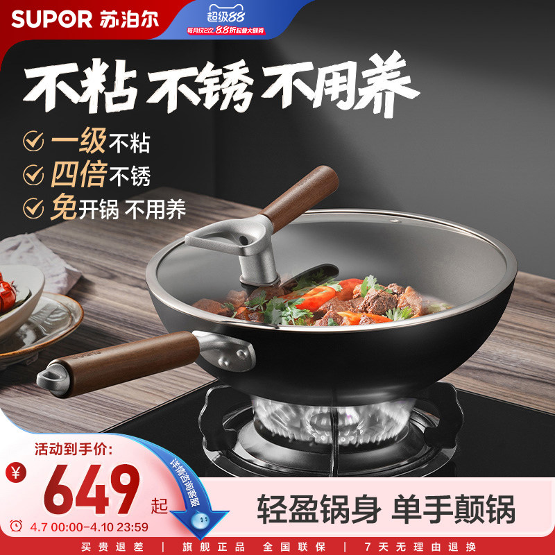 苏泊尔铁锅不粘锅有钛无涂层炒锅家用炒菜锅免开锅电磁炉燃气专用