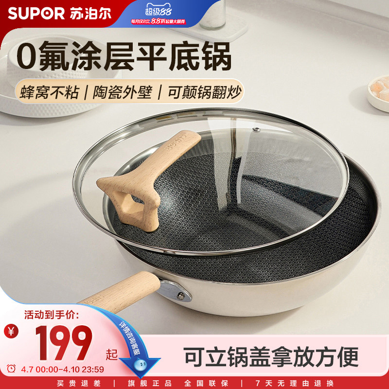 苏泊尔不锈钢煎锅炒菜锅陶瓷覆层不粘锅家用双蜂窝电磁炉燃气通用
