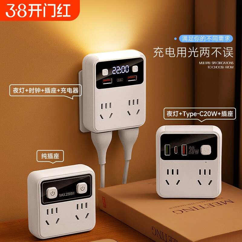 智能插座转换器家用多功能多孔插排学生宿舍usb一转多插板带时钟