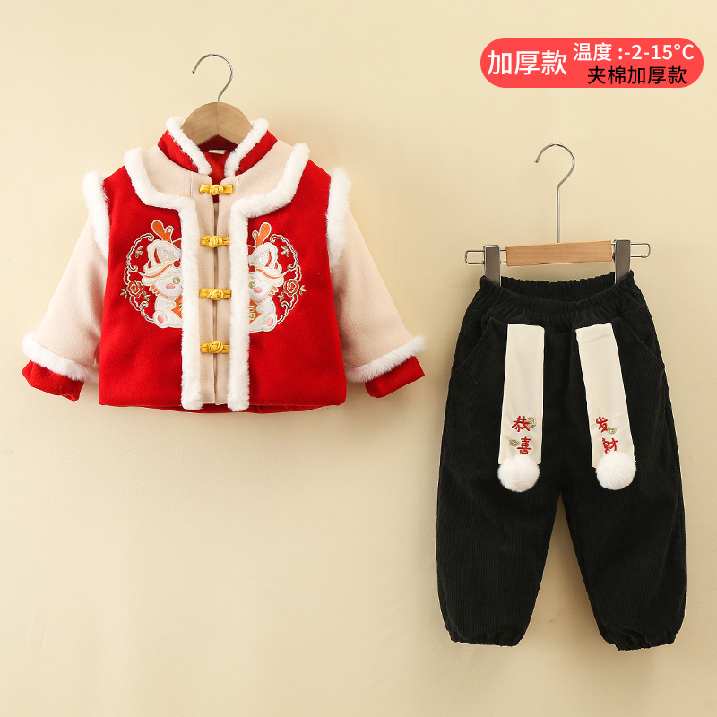 宝宝唐装男女童冬装加绒分体两件套装红色喜庆新年拜年服周岁礼服