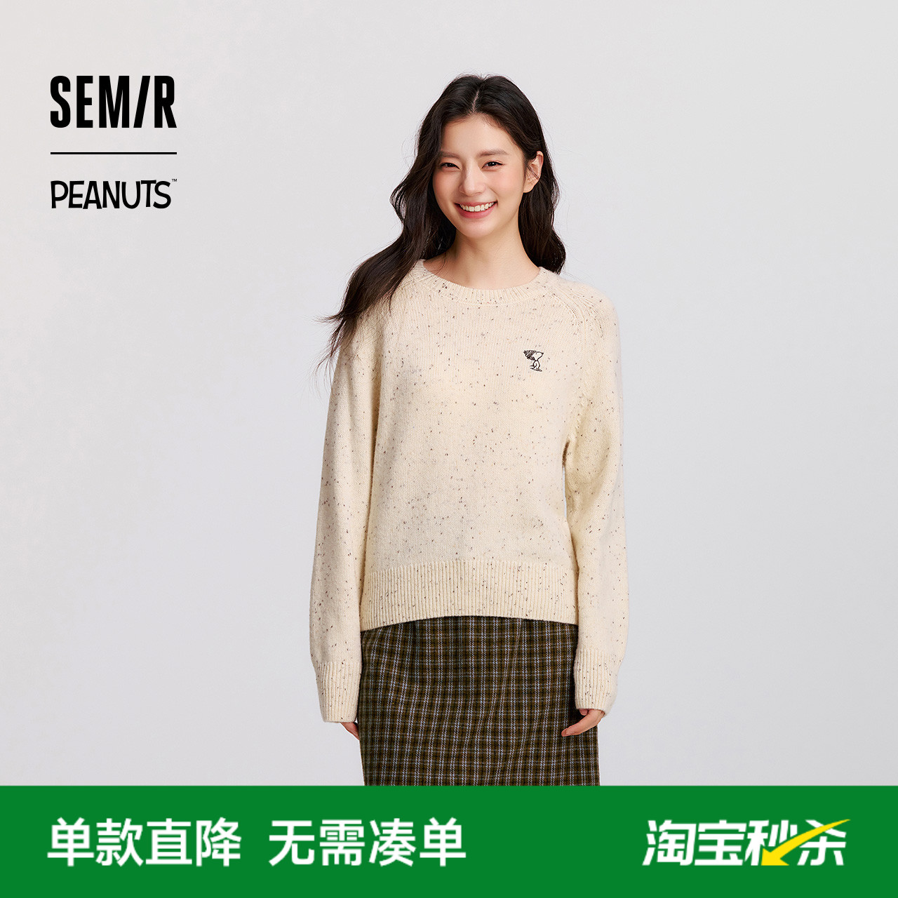 森马史努比系列毛衣女冬彩点含羊毛插肩袖绣花圆领套头衫温柔毛衫