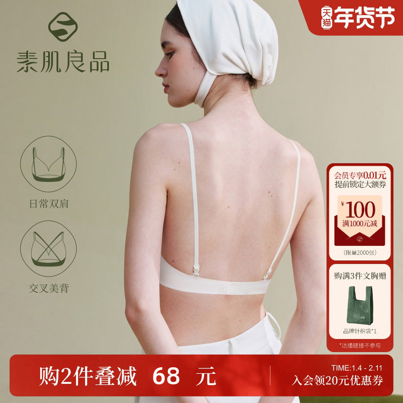 素肌良品白色美背内衣女冬薄款小胸聚拢显大无痕隐形露背文胸u型