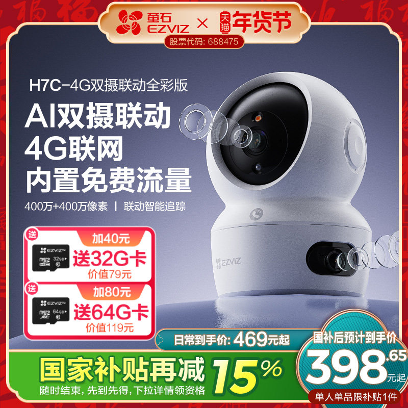 萤石H7c室内双摄云台4G智能AI摄像头手机远程家用360全景超清监控