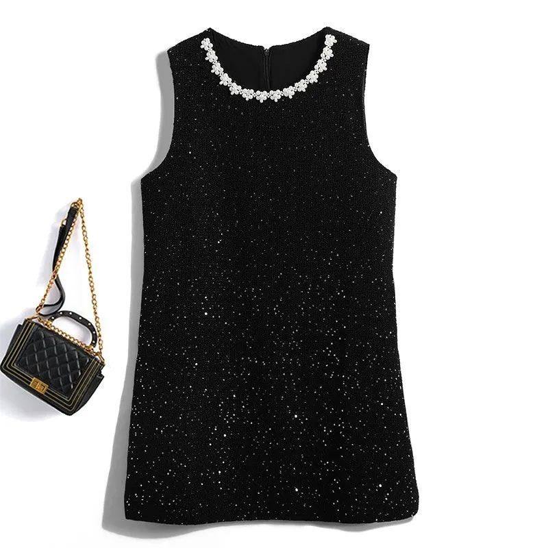 轻奢爆款重工钉珠圆领无袖背心裙秋冬新款洋气减龄亮片显瘦连衣裙