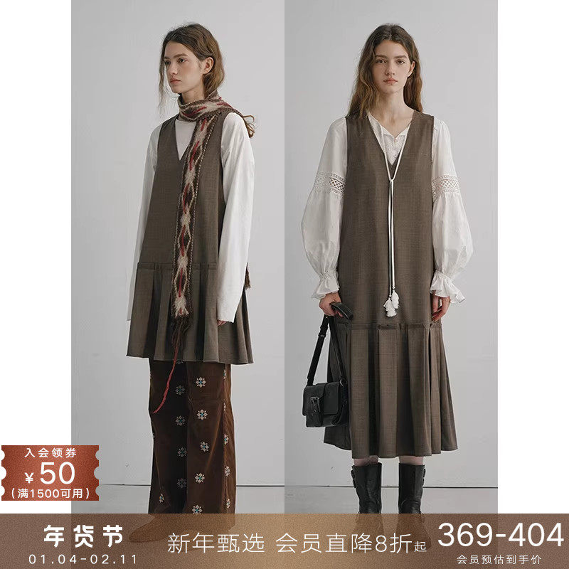 尺尺间Lsland 复古格纹v领背心裙秋冬新款设计感宽松气质a字长裙