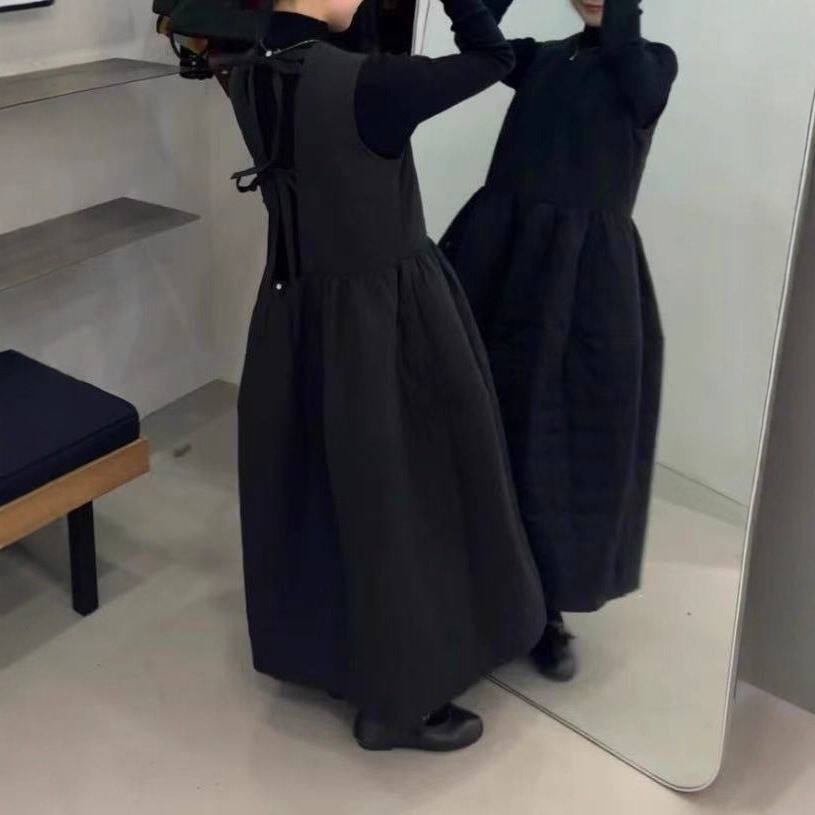 韩系夹棉背心裙秋冬款后背绑带叠穿裙中长款冬季显瘦薄夹棉连衣裙