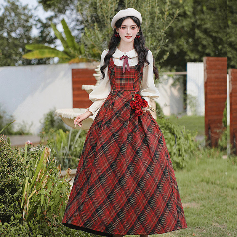 苏浅慕颜法式复古格纹毛呢背心裙秋冬打底长裙少女学院气质连衣裙