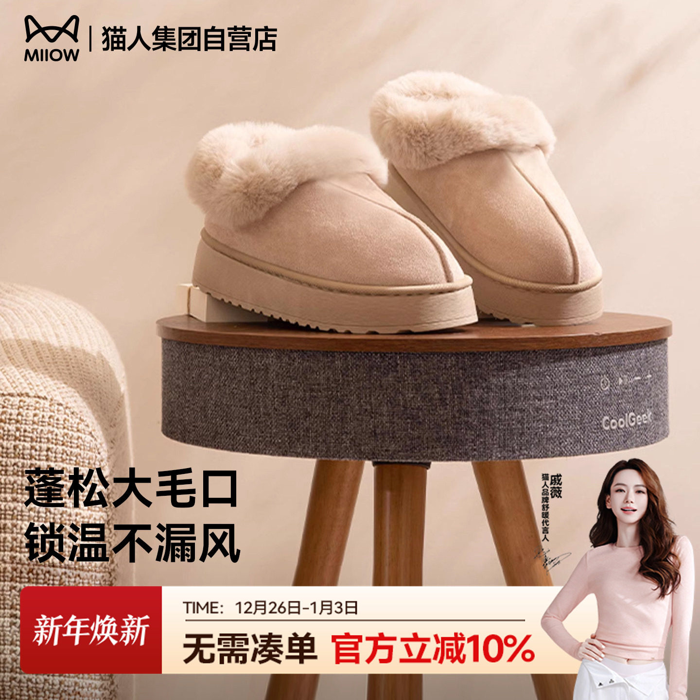 猫人4CM厚底麂皮毛绒拖鞋女秋冬加厚加绒保暖包跟防滑室外雪地靴