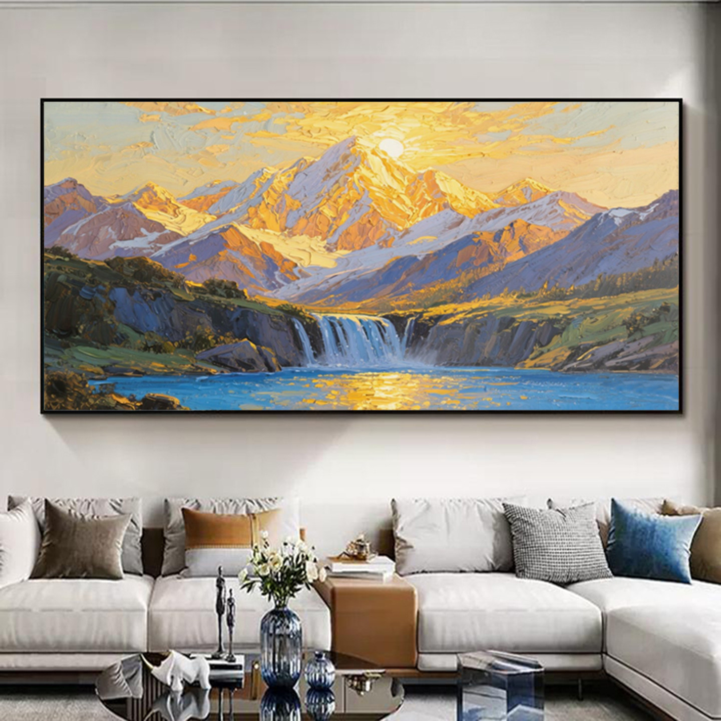 纯手绘油画日照金山聚宝盆流水生财印象挂画客厅餐厅卧室手工挂画