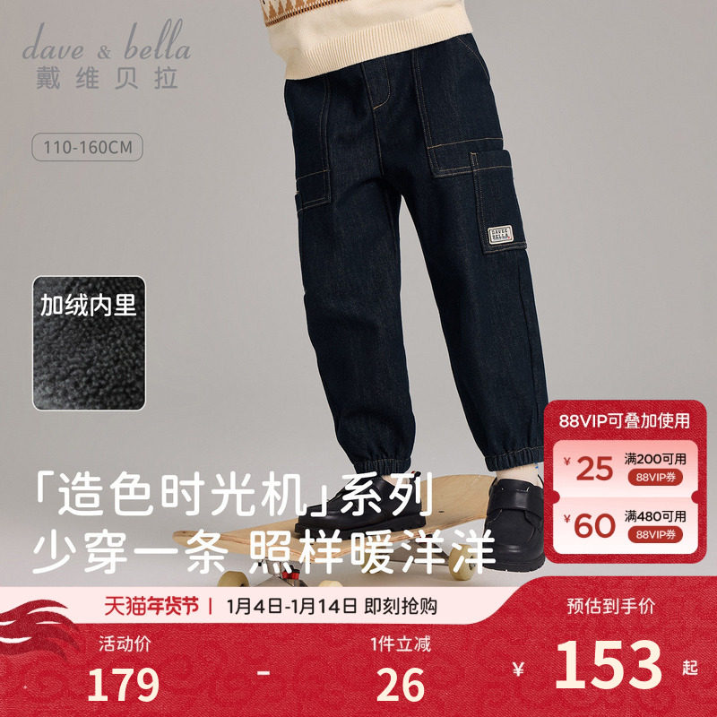 戴维贝拉儿童牛仔裤2026男童新款工装裤中大童加绒裤冬装黑色长裤