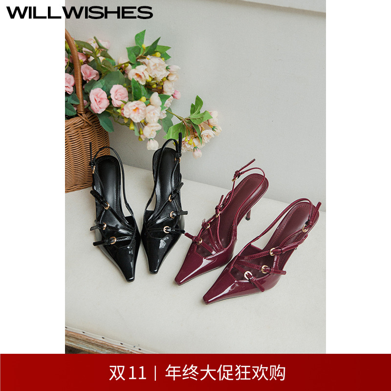 尖头酒水钻红色高跟鞋女2024秋冬新款漆皮性感御姐凉鞋后空宴会鞋