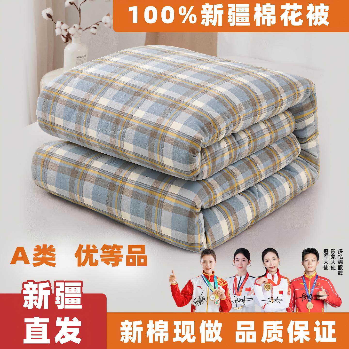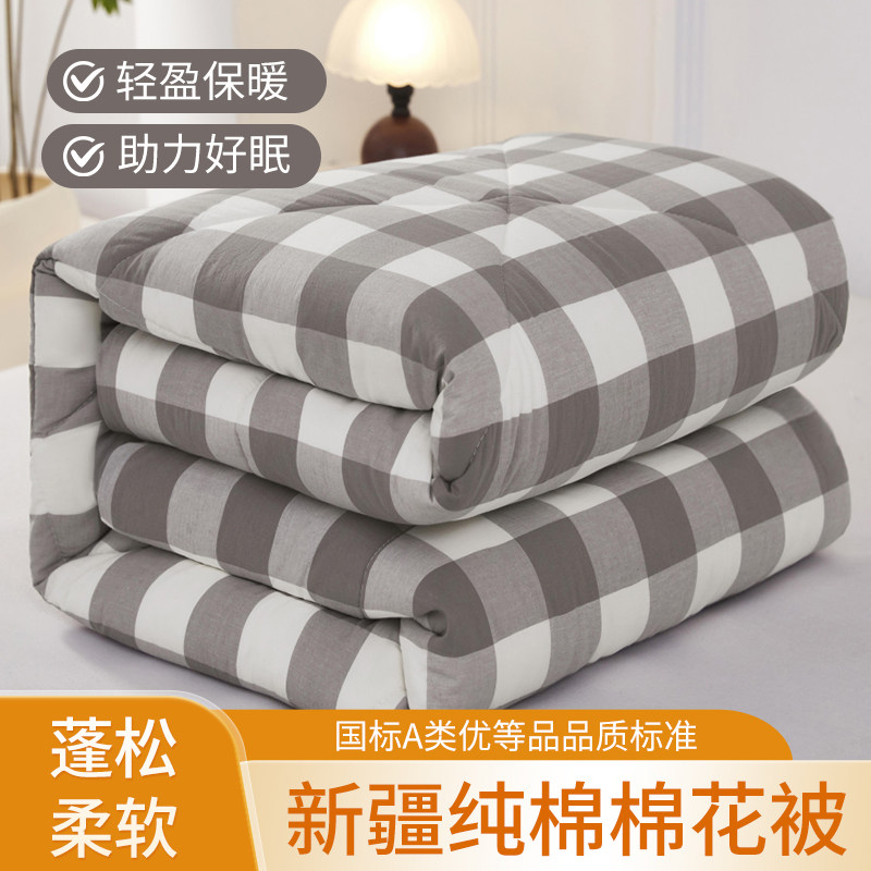新疆棉花被A类优等品绗缝简约蓝格四季通用格纹春秋冬被100%棉花