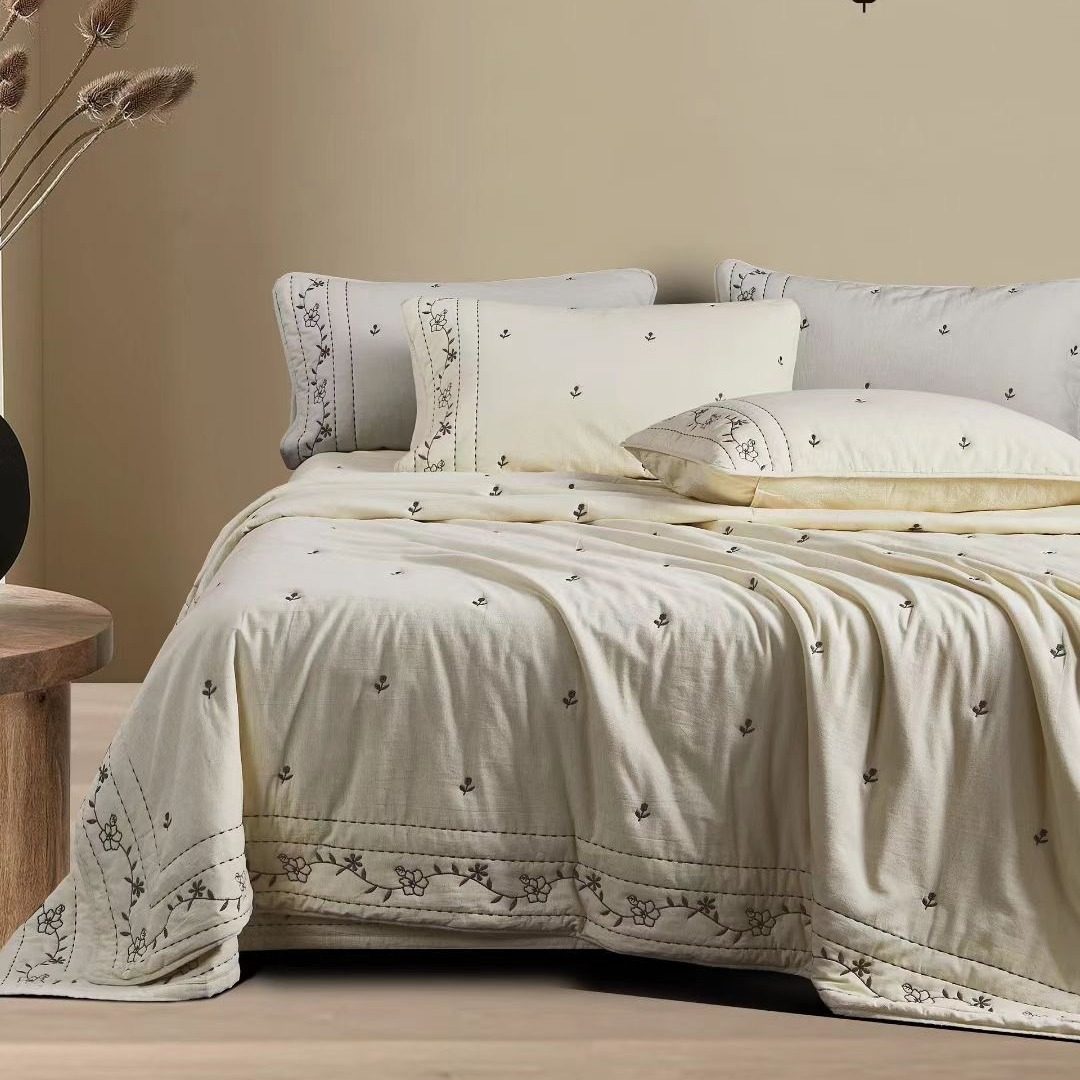 米色繁花绗缝被三件套纯色全棉床盖衍缝床单双人春秋被【纤之色】