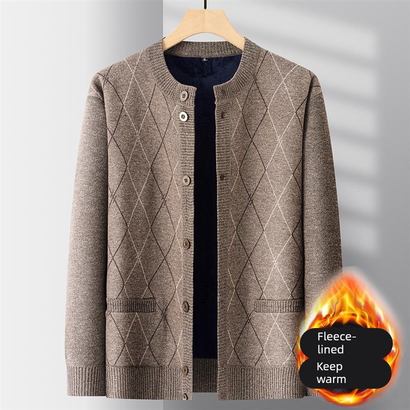 爸爸圆领开衫毛衣加绒加厚款中老年人男士针织外套爷爷秋冬装上衣