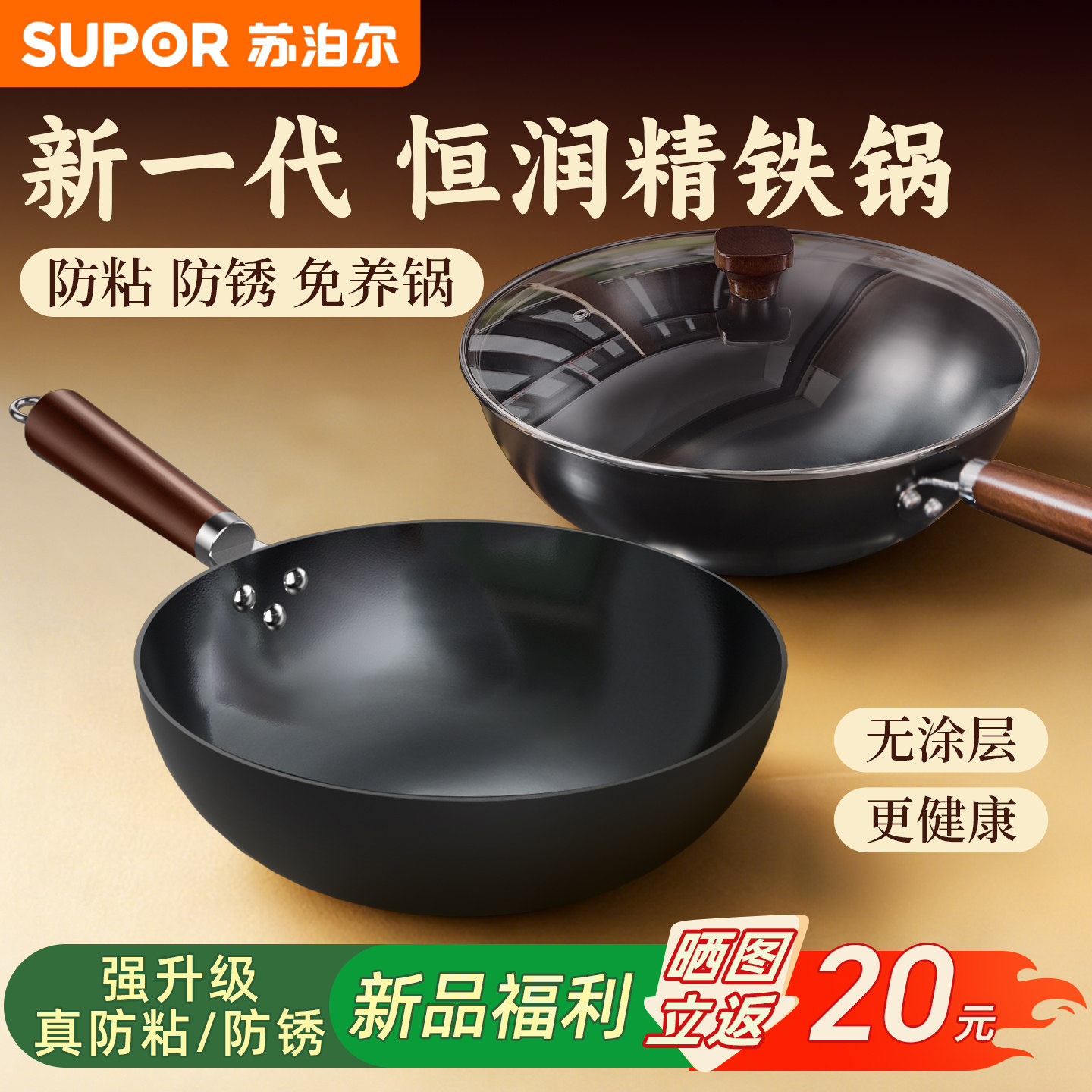 新品苏泊尔有钛铁锅铁不粘无涂层钛锅家用炒锅不粘锅炒菜锅铸铁锅