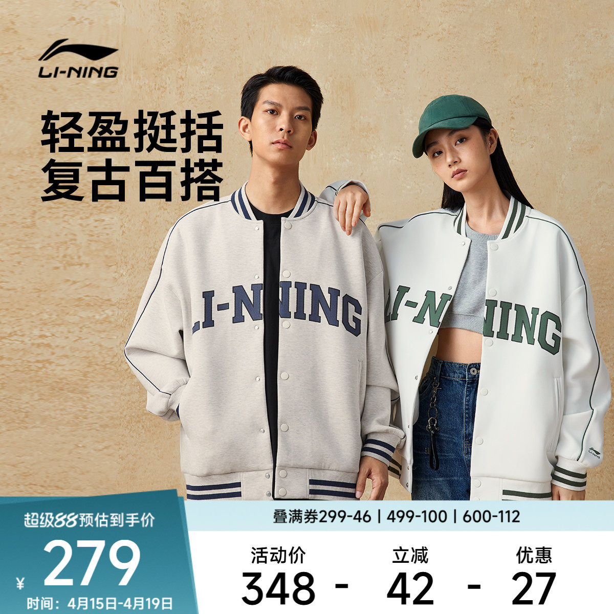 李宁运动服 运动时尚系列 男女复古逐潮轻盈蓬松挺阔开衫无帽卫衣