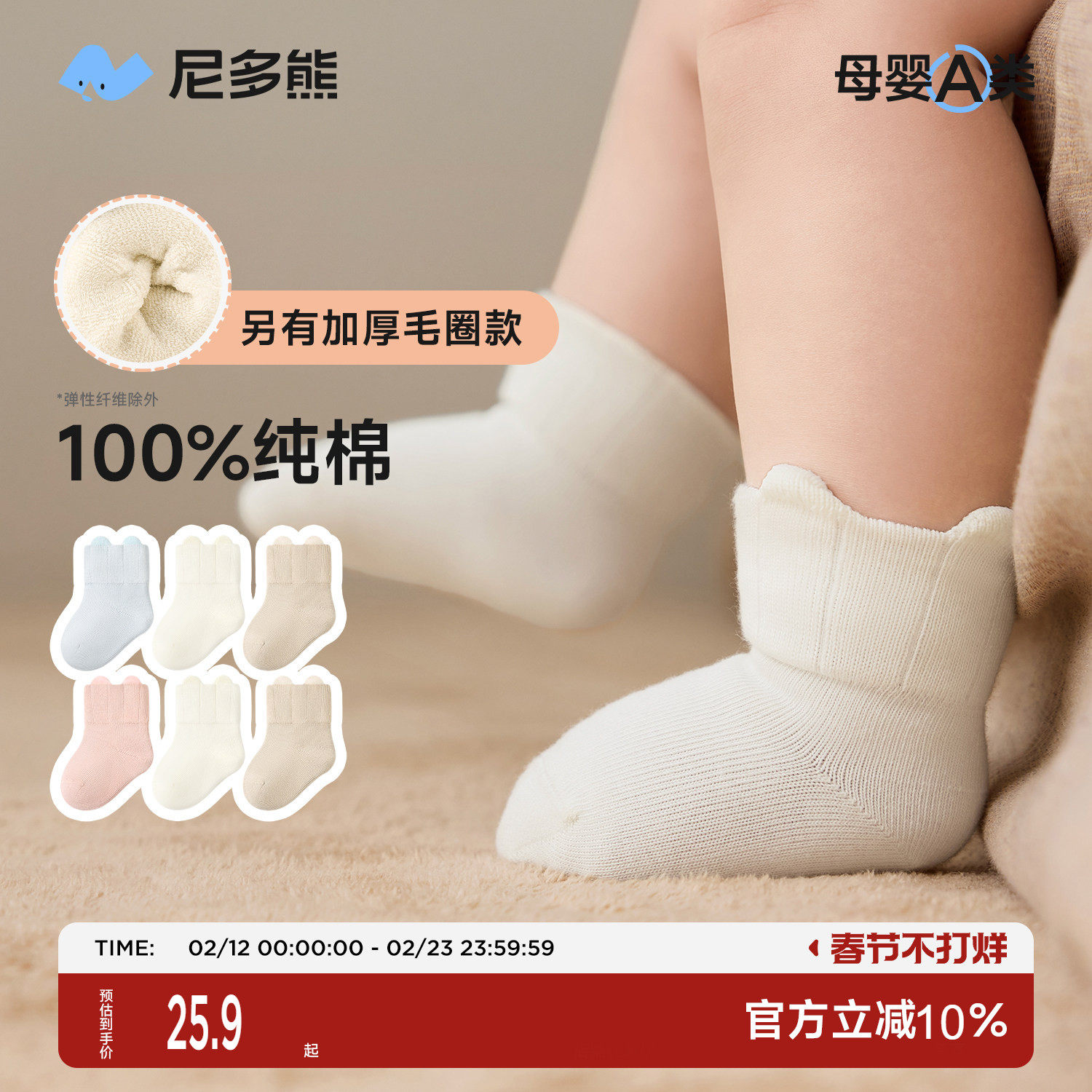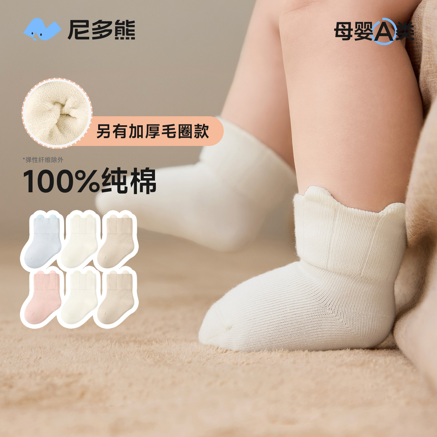 尼多熊加厚纯棉新生儿袜子秋冬季婴儿a类冬宝宝0到3月宝宝毛圈袜
