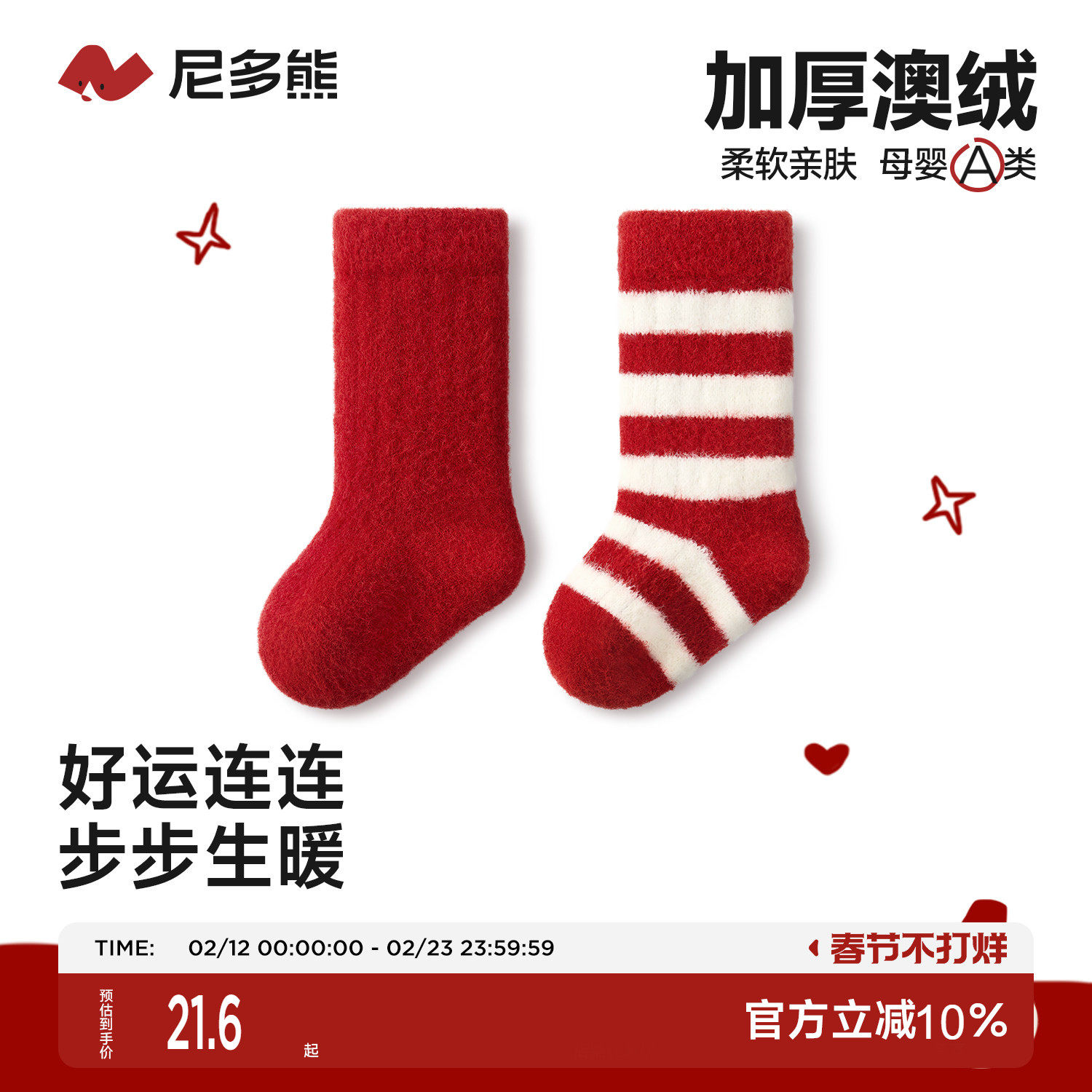 尼多熊新生婴儿红袜子冬季中筒加绒宝宝红色新年袜本命年过年儿童