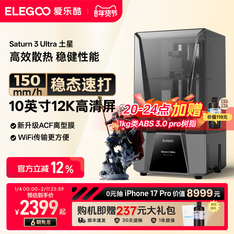 ELEGOO/爱乐酷Saturn 3 Ultra土星光固化3d打印机10寸12K黑白屏桌面级家用高精度工业级儿童玩具模型diy套件