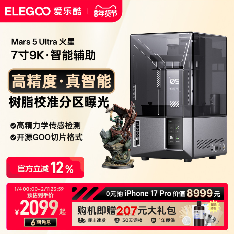 ELEGOO/爱乐酷Mars 5 Ultra火星光固化3d打印机7寸9K桌面级家用高精度工业级儿童玩具定制模型diy套件