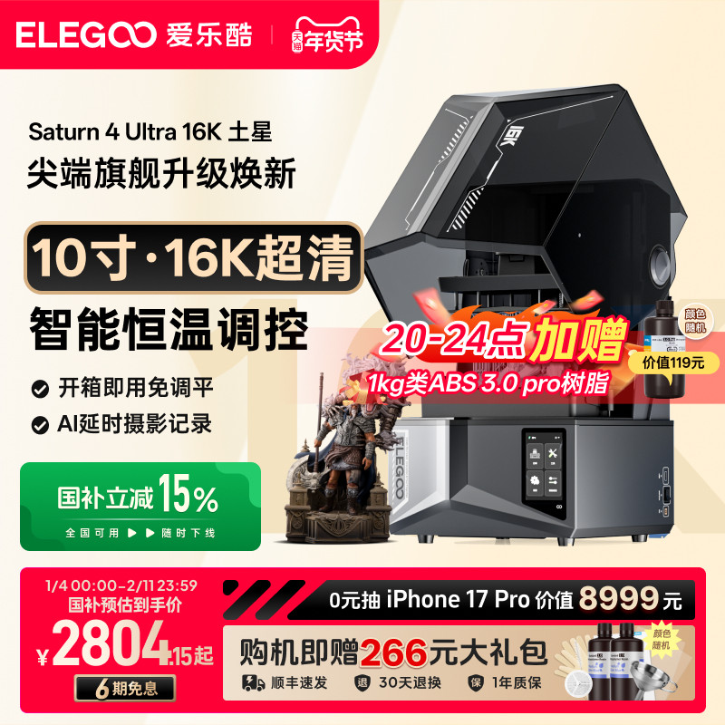 ELEGOO/爱乐酷Saturn 4 Ultra 16K土星4U光固化3d打印机家用10寸桌面级高精度立体机器手办模型3d立体打印机