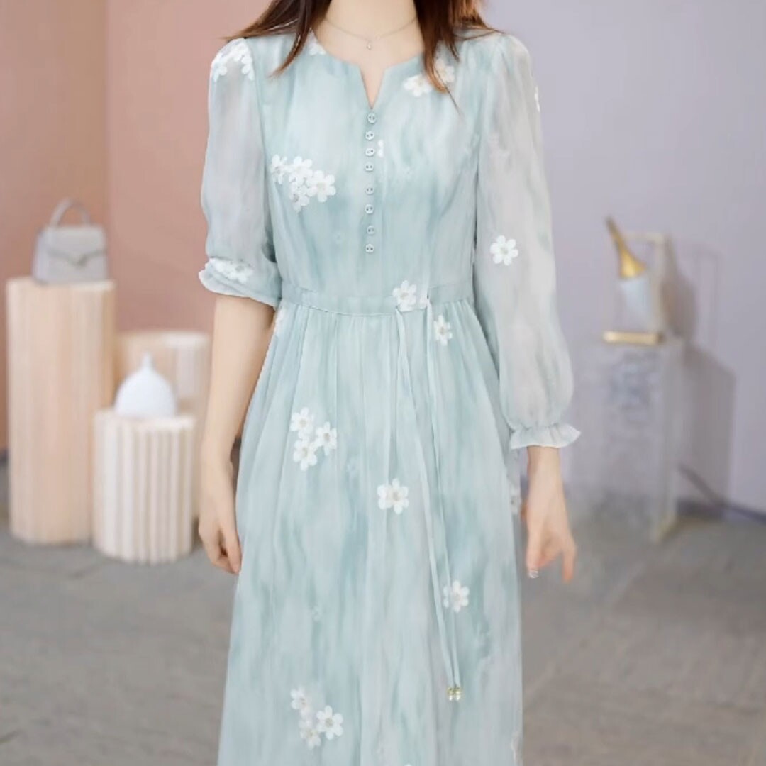 从那以后法式茶歇裙雪纺长裙碎花小裙子夏季高级感短袖连衣裙女夏