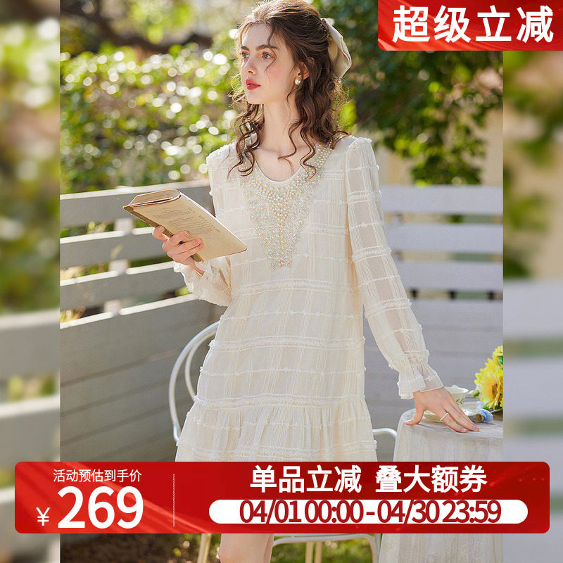白鹿语浪漫小香风vU领连衣裙女26春季新款钉珠雪纺氛围感长袖短裙
