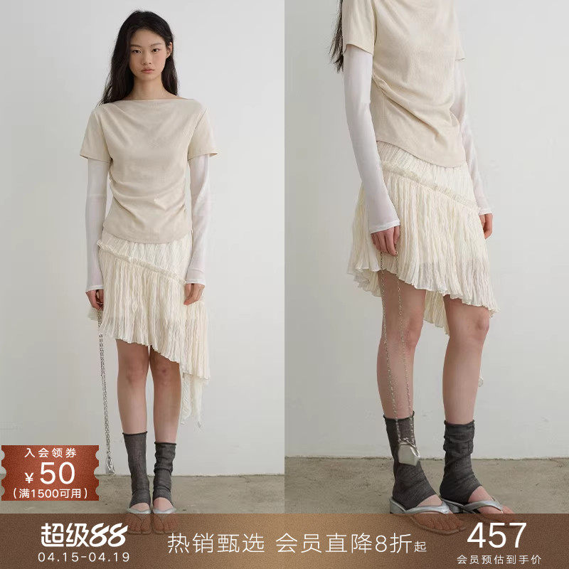 popchrio◆别致不规则百褶雪纺蕾丝半身裙小个子甜美a字短裙子女