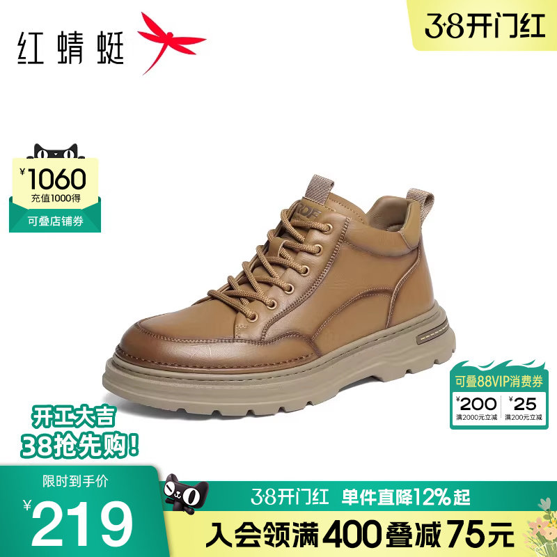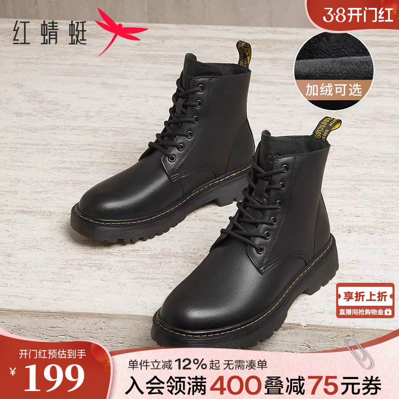 红蜻蜓厚底马丁靴2025秋冬新款男鞋牛皮系带短靴英伦复古机车靴男