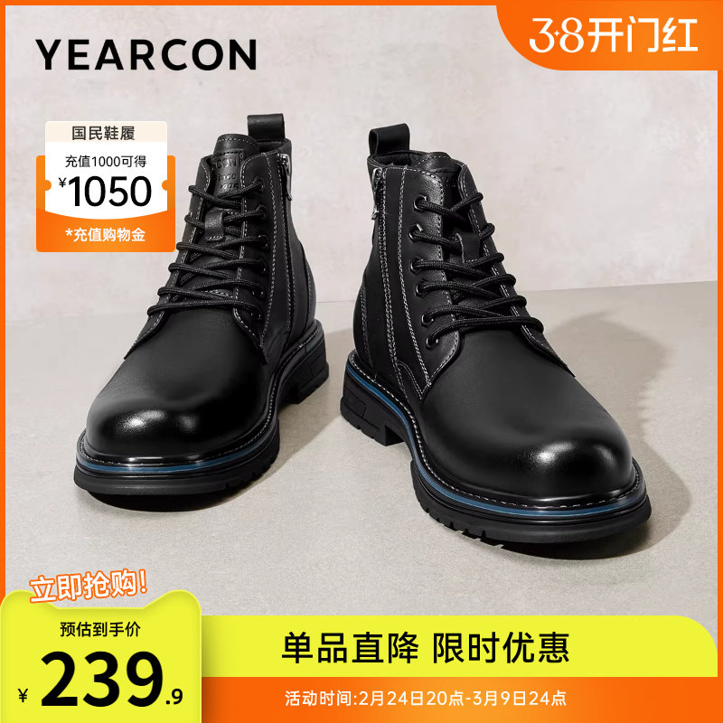 意尔康男鞋秋冬厚底男士复古加绒马丁靴英伦风短靴户外休闲工装靴