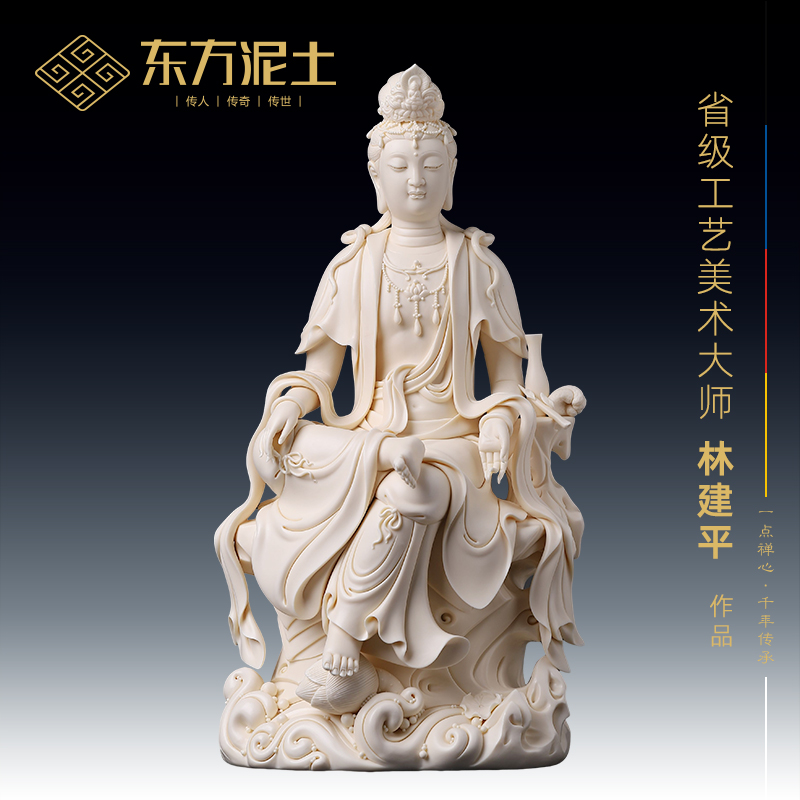 东方泥土 林建平作品陶瓷摆件《自在观音像 猛犸牙黄》客厅装饰品