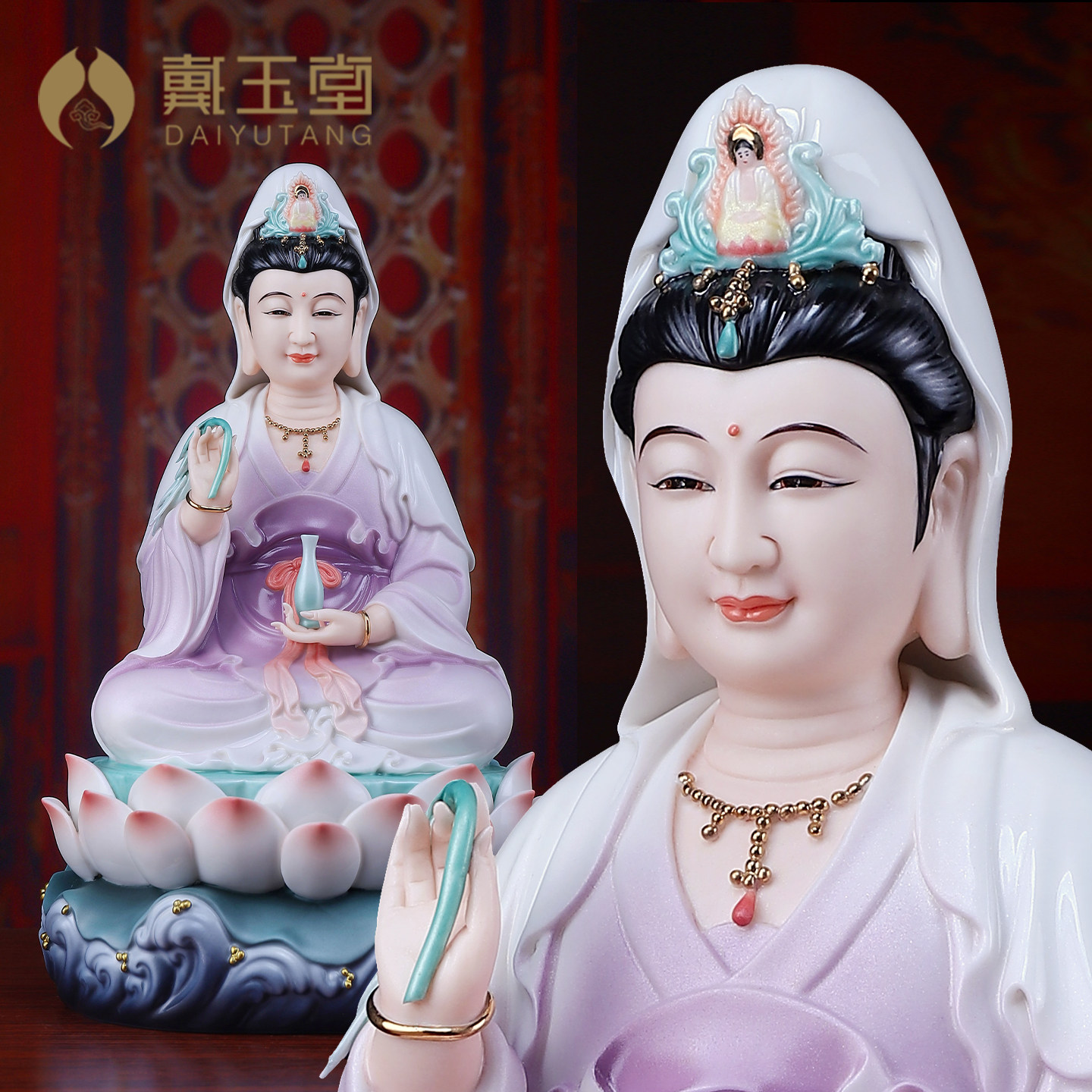 戴玉堂陶瓷摆件宝莲观音像金韵彩佛像客厅供奉家用观世音菩萨坐像