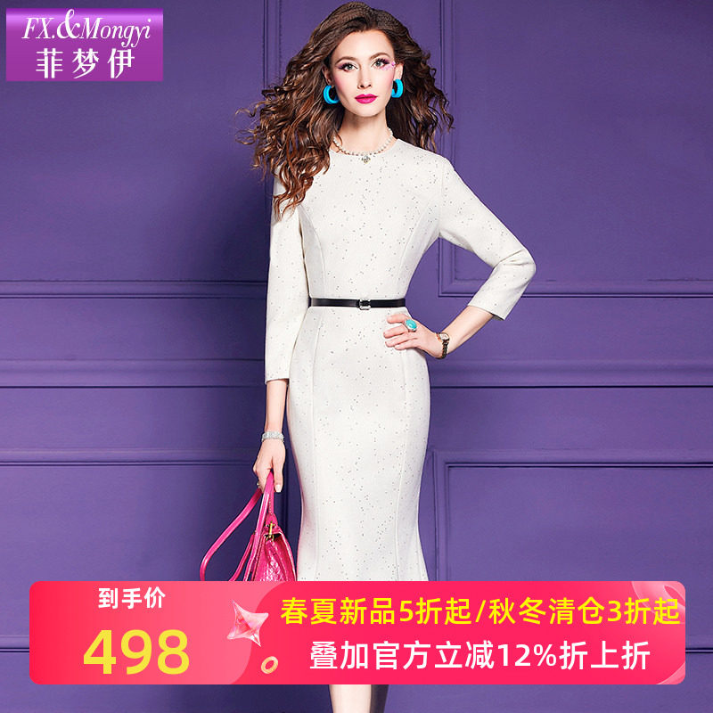 菲梦伊含羊毛白色毛呢连衣裙女秋季轻熟高端加厚烫钻气质鱼尾裙子