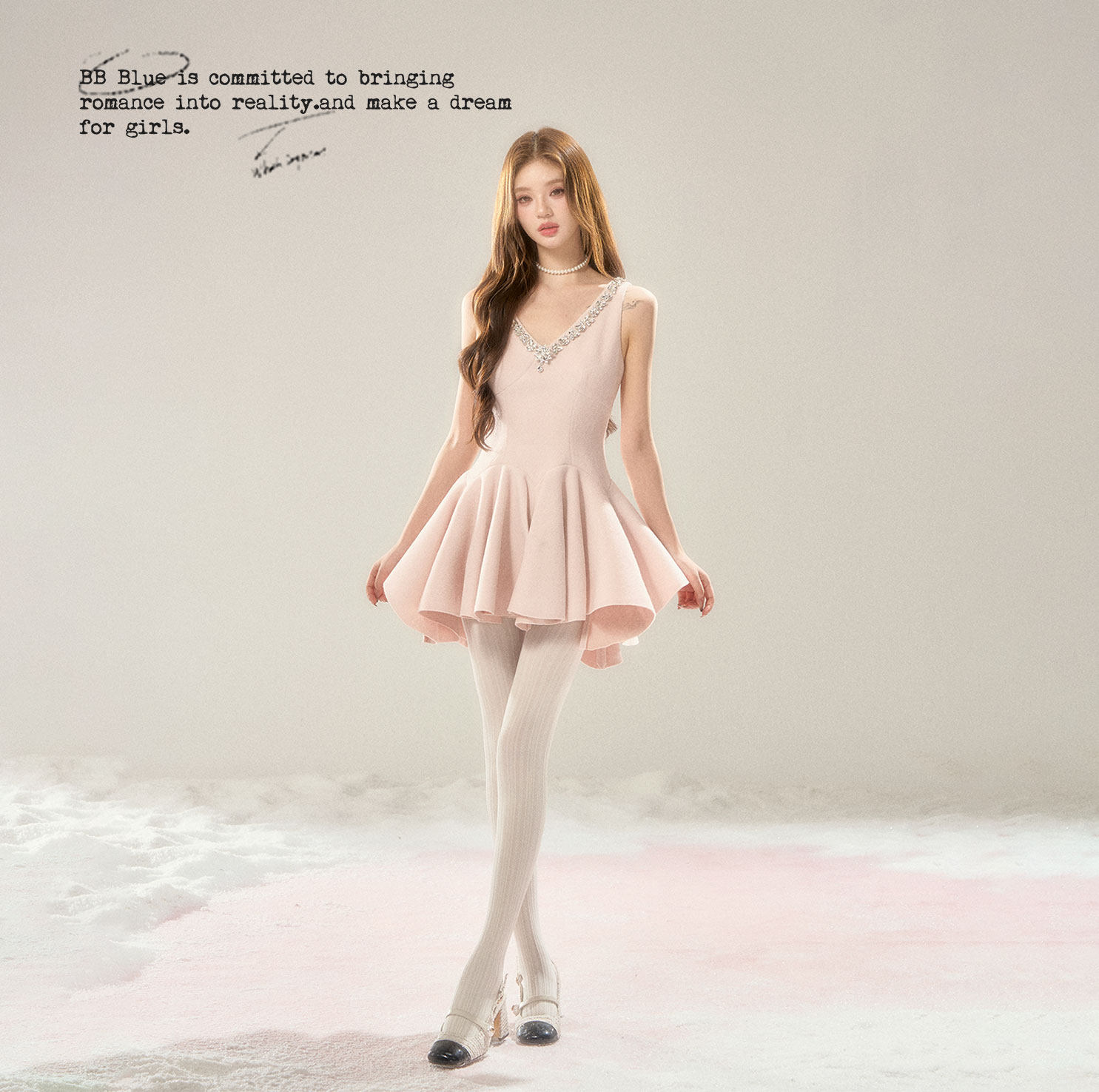 BB BLUE/浪漫甜心/V领毛呢2025年新款收腰法式千金感时尚连衣裙女