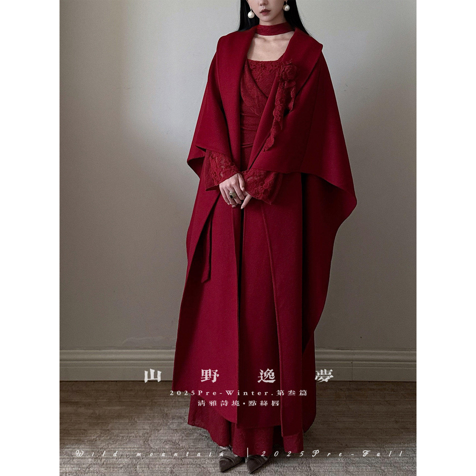 山野逸梦秋冬优雅气质红色冬连衣裙毛呢圣诞斗篷外套约会轻奢年会