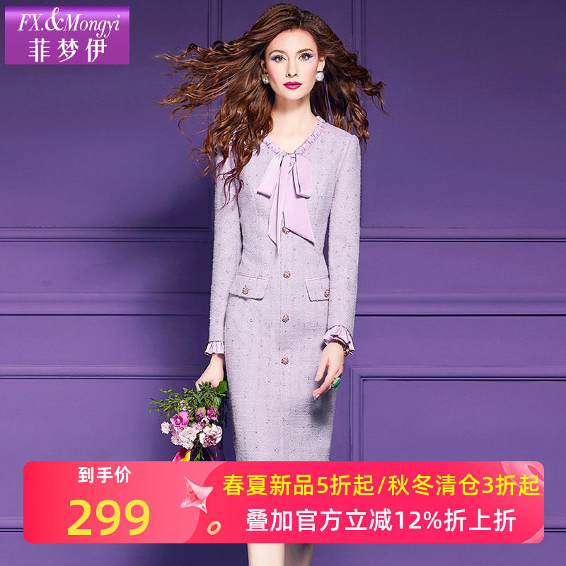 菲梦伊原创紫色含羊毛真丝毛呢连衣裙女春装复古高端收腰名媛裙子