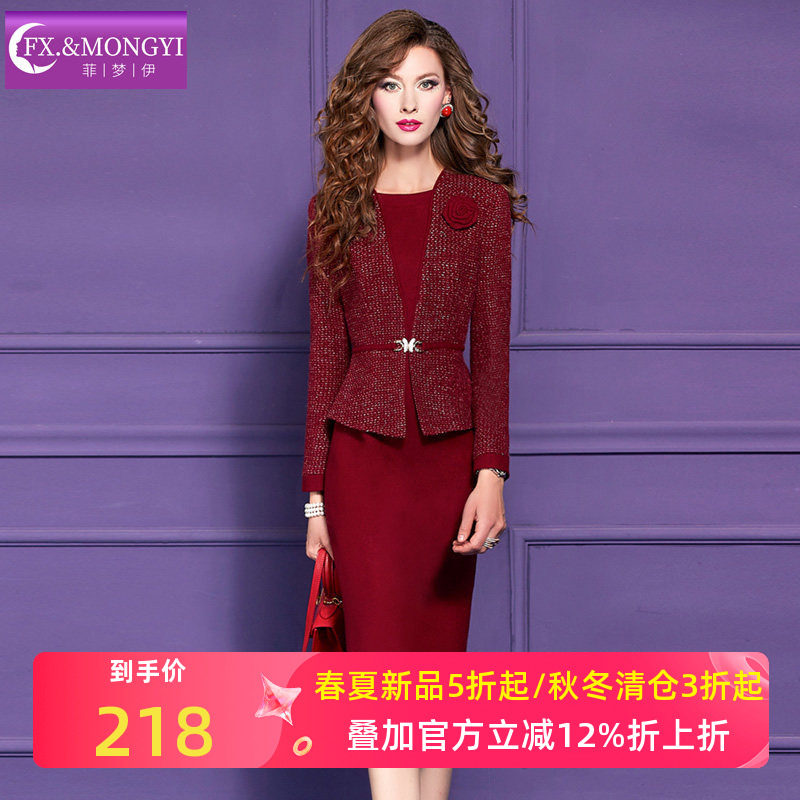 菲梦伊含羊毛假两件红色连衣裙女冬季小香风名媛职业毛呢包臀裙子