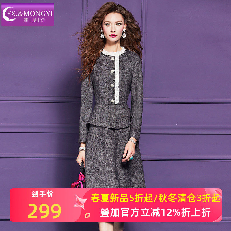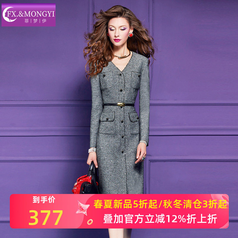 菲梦伊原创高级灰毛呢连衣裙女春季复古名媛小香风收腰V领中长裙