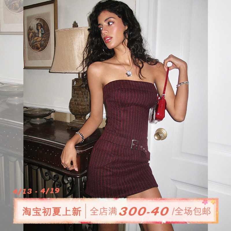 ITSNIKAR 经典酒红条纹抹胸连衣裙女毛呢裙新年节日氛围感短裙子