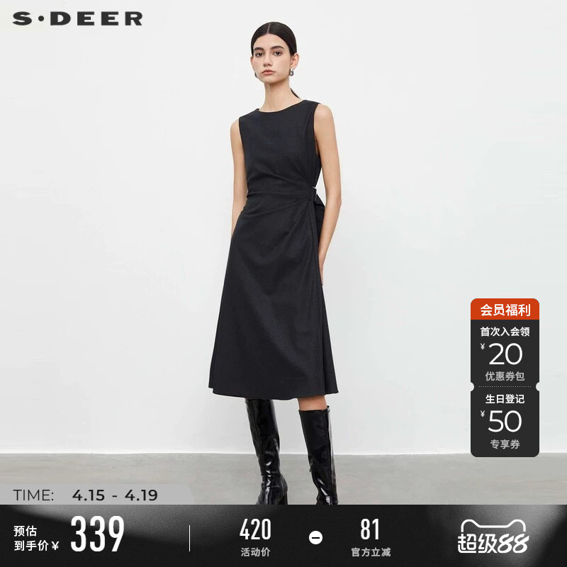 sdeer圣迪奥春秋装女装圆领收腰不规则毛呢无袖连衣裙S23381210